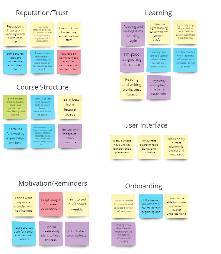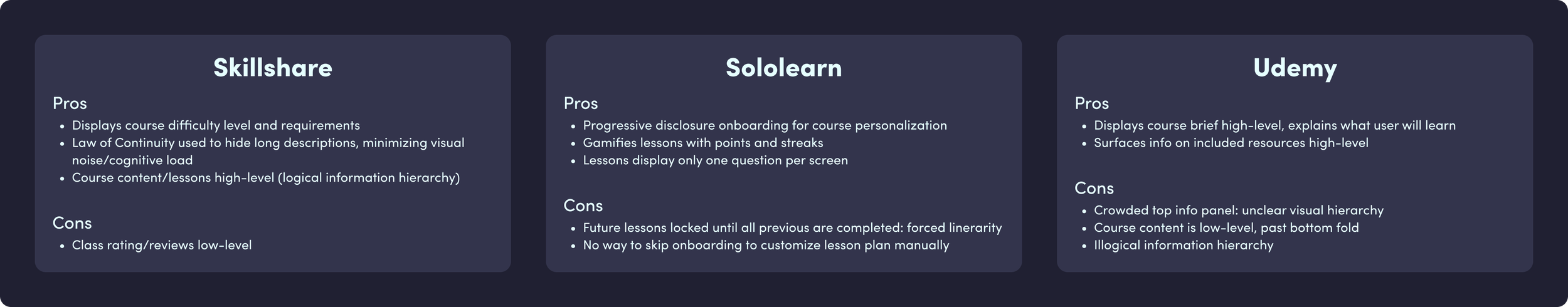 My final choices were Udemy, Skillshare, and Sololearn. Udemy was added in after user interviews, as many participants reported using and enjoying the platform. Some others in the running included Duolingo and Coursera, though I felt the insights observed were repetitive and redundant to include.