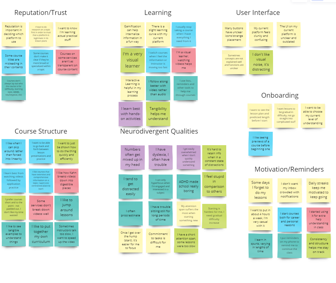 I took my findings and sorted two affinity maps: one for neurodivergent users and one for neurotypical users.