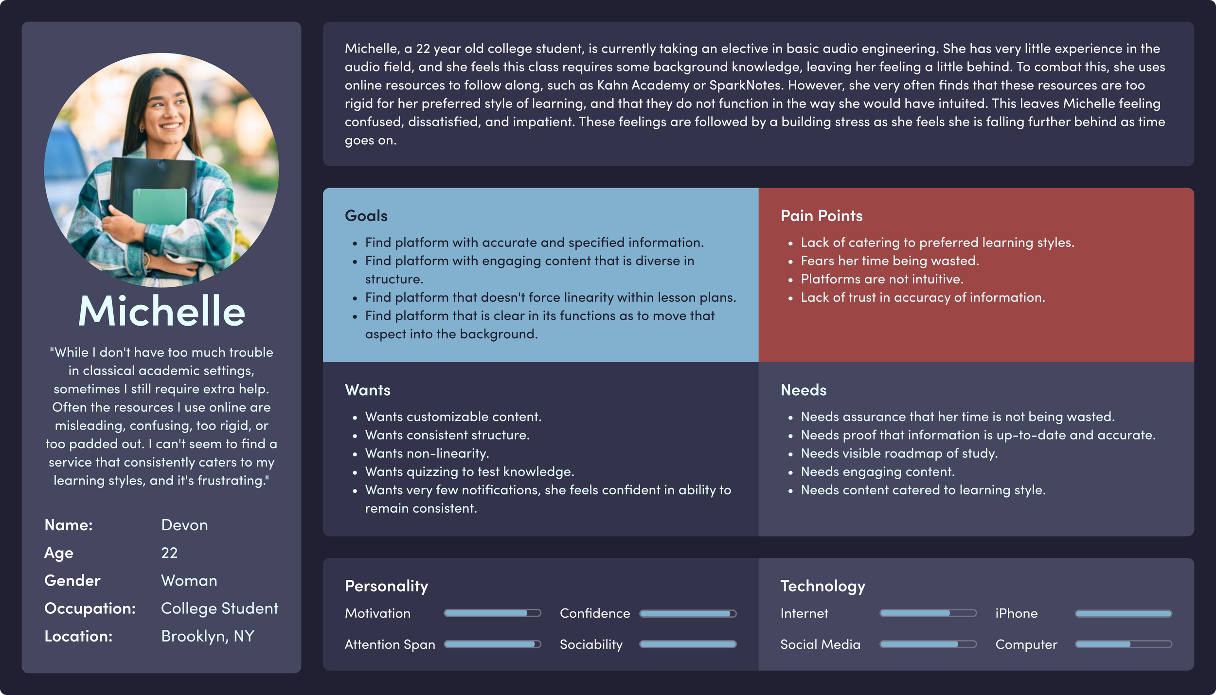 Using the empathy maps, I created their two respective personas to go with them. I had to be thorough here because while one of our developers was neurodivergent (he has ASD), the other two are neurotypical. I needed to be sure to be broad but specific to ensure everybody involved could empathize efficiently. The neurotypical persona stayed relatively the same throughout the project sans some wording, but the neurodivergent persona had to go through many iterations due to misunderstandings of user needs.